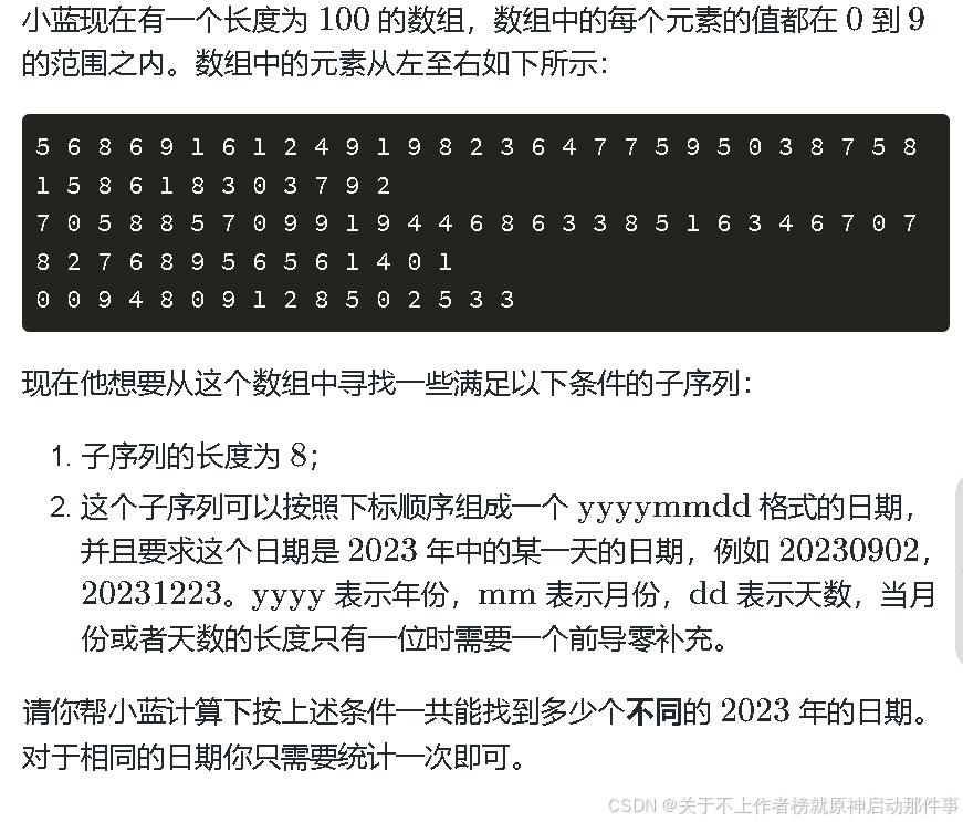 考察知识:日期的基本常识,和模拟全部解的思想。当我们发现从题目给的条件里去找答案会形成很多可能的时候,我们就可以考虑使用dfs深度优先搜索,或者模拟全部解。这个题目要求我们从这个数组中去寻找可能出现的天数,直接去找显然不可能,我们尝试去看所有解的情况,也就365天的情况,所以我们遍历所有的月份天数,比从给的数组里面去找合适的天数要简单的多。