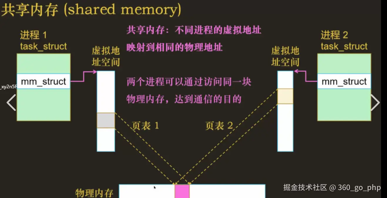 shmget和shmat)可以让多个进程将某一块物理内存区域映射到各自的虚拟地址空间,这样它们就能直接读写共享内存区的数据。共享内存是一种高效的进程间通信方式,但需要通过信号量、互斥锁等机制来避免竞争条件。 - 线程共享内存:线程是进程的一部分,同一进程中的所有线程天然共享该进程的内存区域。因此,线程间的内存共享是默认的。线程可以直接读写进程中的堆、全局变量和静态变量。但要注意,多线程并发访问共享内存时需要考虑同步问题,以防止数据竞争和不一致性。