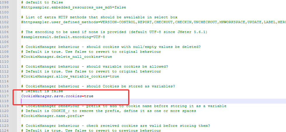 2、jmeter的bin目录下找到 jmeter.properties 文件,修改CookieManager.save.cookies=false 改为CookieManager.save.cookies=true,并去掉前面的#注释,如图;保存并重启jmeter