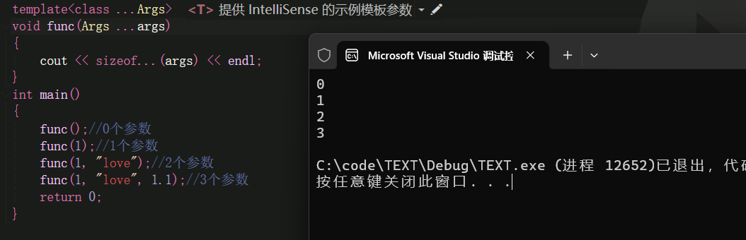 1. ...表示 "参数包",可接收 0 个或多个参数2. 用sizeof...(args)获取参数个数 |