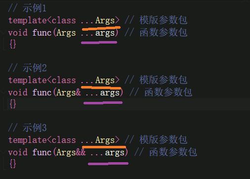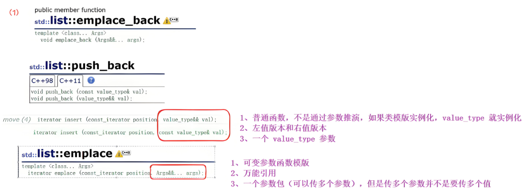 | 完美转发参数包 | template<class ...Args>``void func(Args&&... args){ emplace(args...);``} |