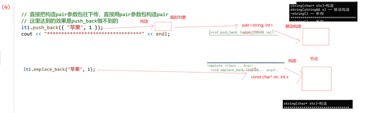 | emplace 系列接口(STL) | list<pair<string, int>> lt;``lt.emplace_back("苹果", 1);//直接传构造参数 |