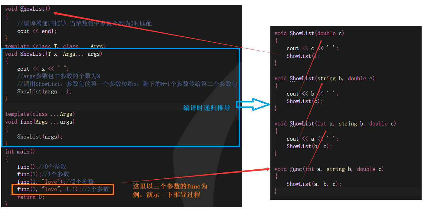 | 包扩展(递归方式) | void ShowList(){}//递归终止条件``template<class T, class ...Args>``void ShowList(T x, Args... args){ cout<<x<<" "; ShowList(args...);``} |