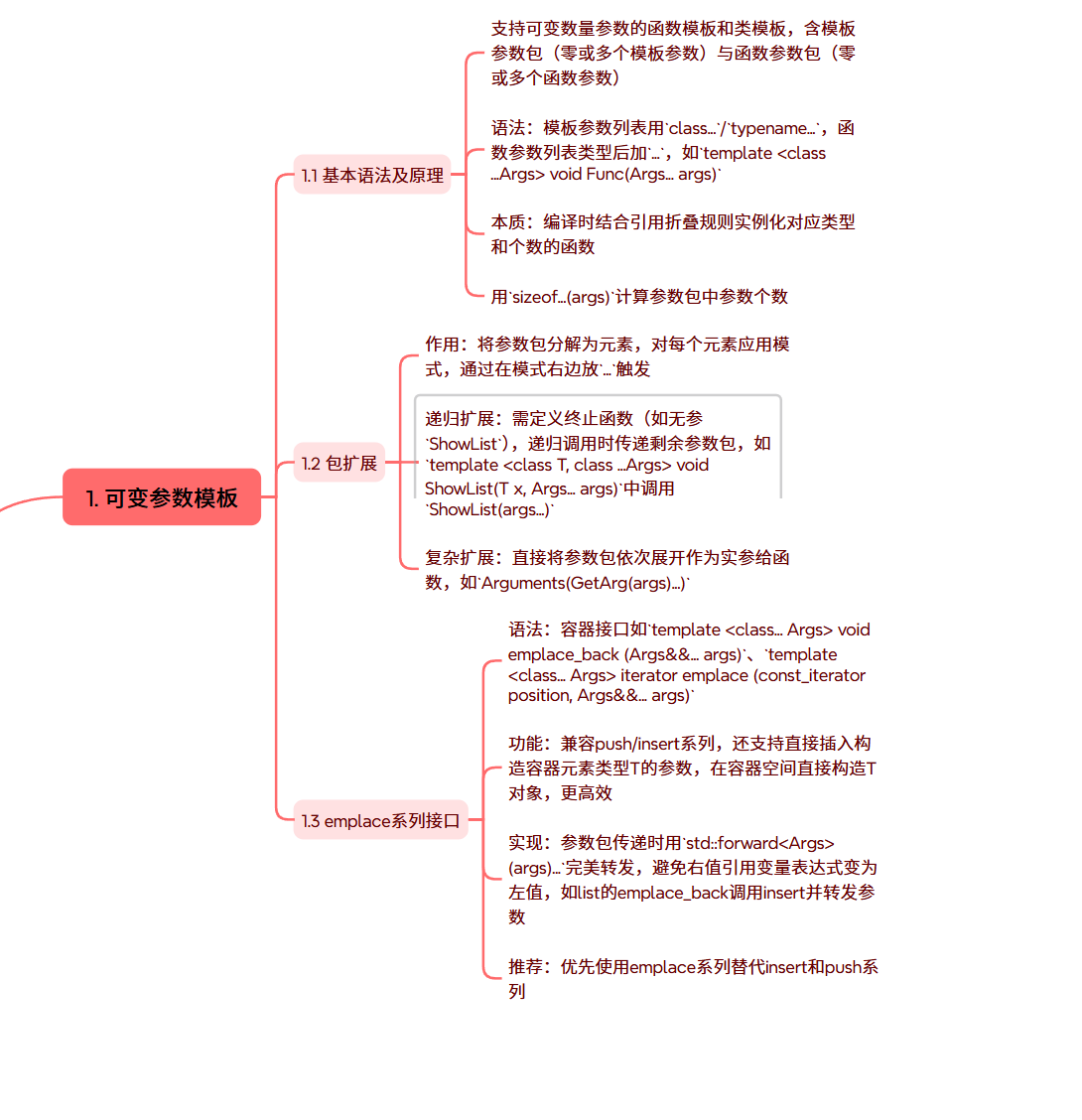 | 可变参数模板 | 基础语法结构 | 模板参数包:template<class ...Args>函数参数包:void func(Args ...args) |