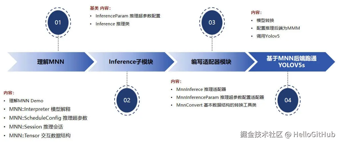 nndeploy 的多端推理模块为不同推理后端提供统一接口,开发者无需关心底层框架差异。例如,新增 MNN 推理后端的流程包括:
