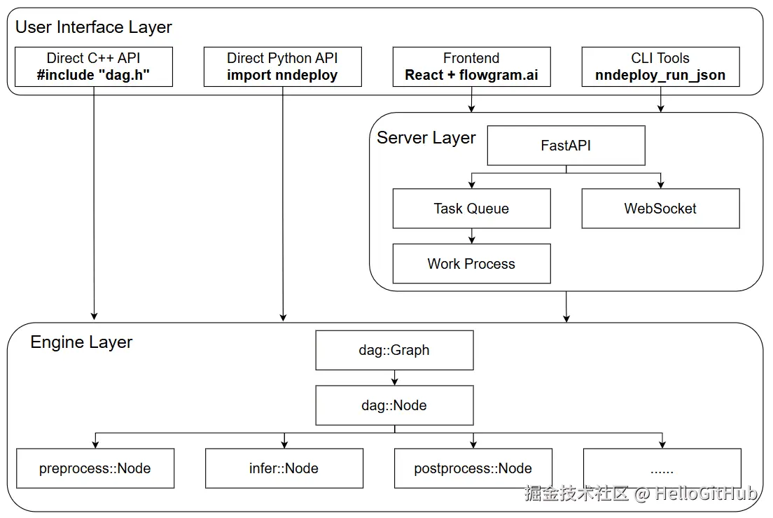 nndeploy 通过将 AI 算法拆解为工作流节点 进行部署,采用三层分离架构设计,整体结构如图所示: