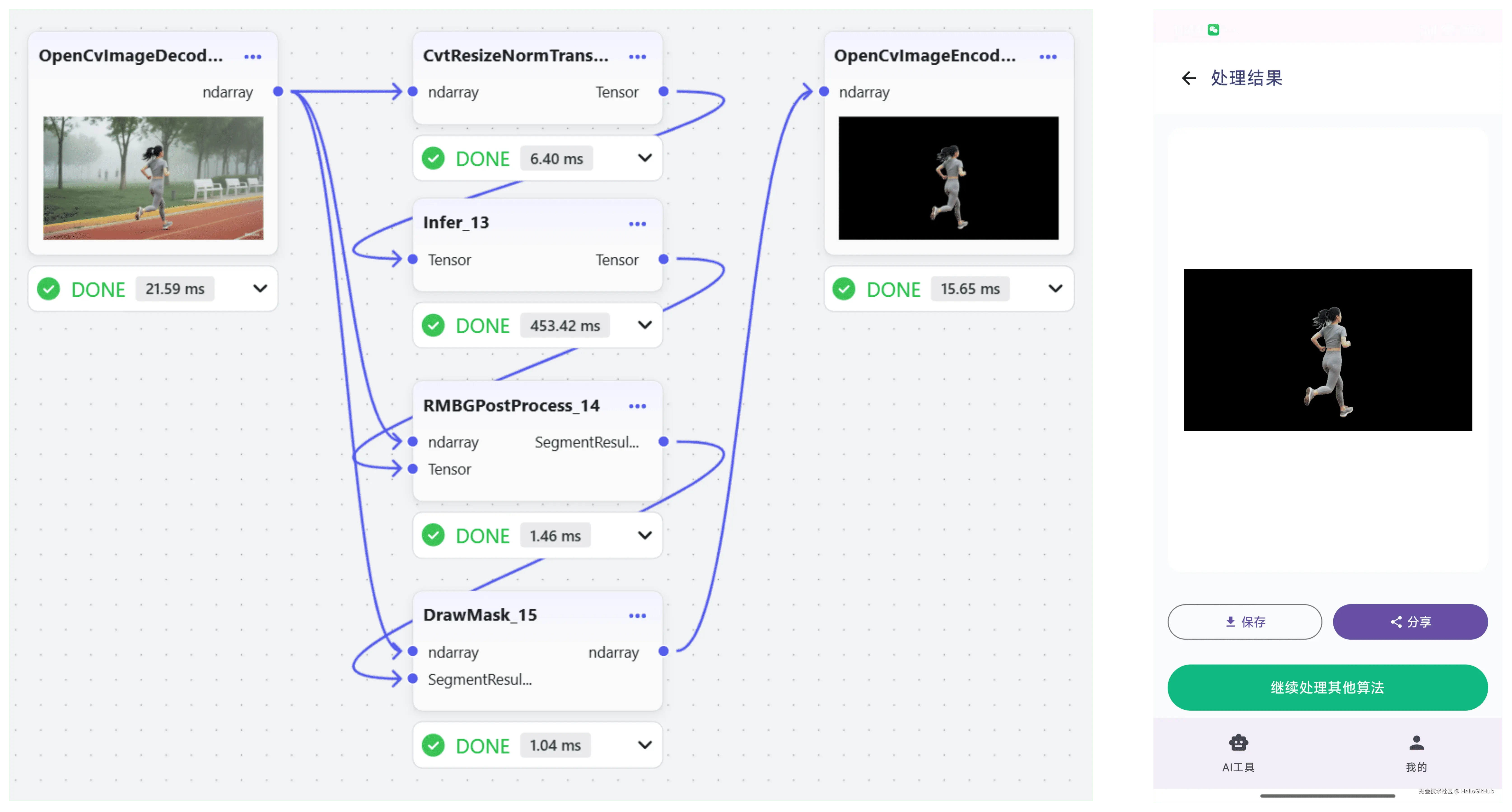 - 一键多端部署:工作流支持导出为 JSON,可通过 C++/Python API 调用,适用于 Linux、Windows、macOS、Android、iOS 等平台。