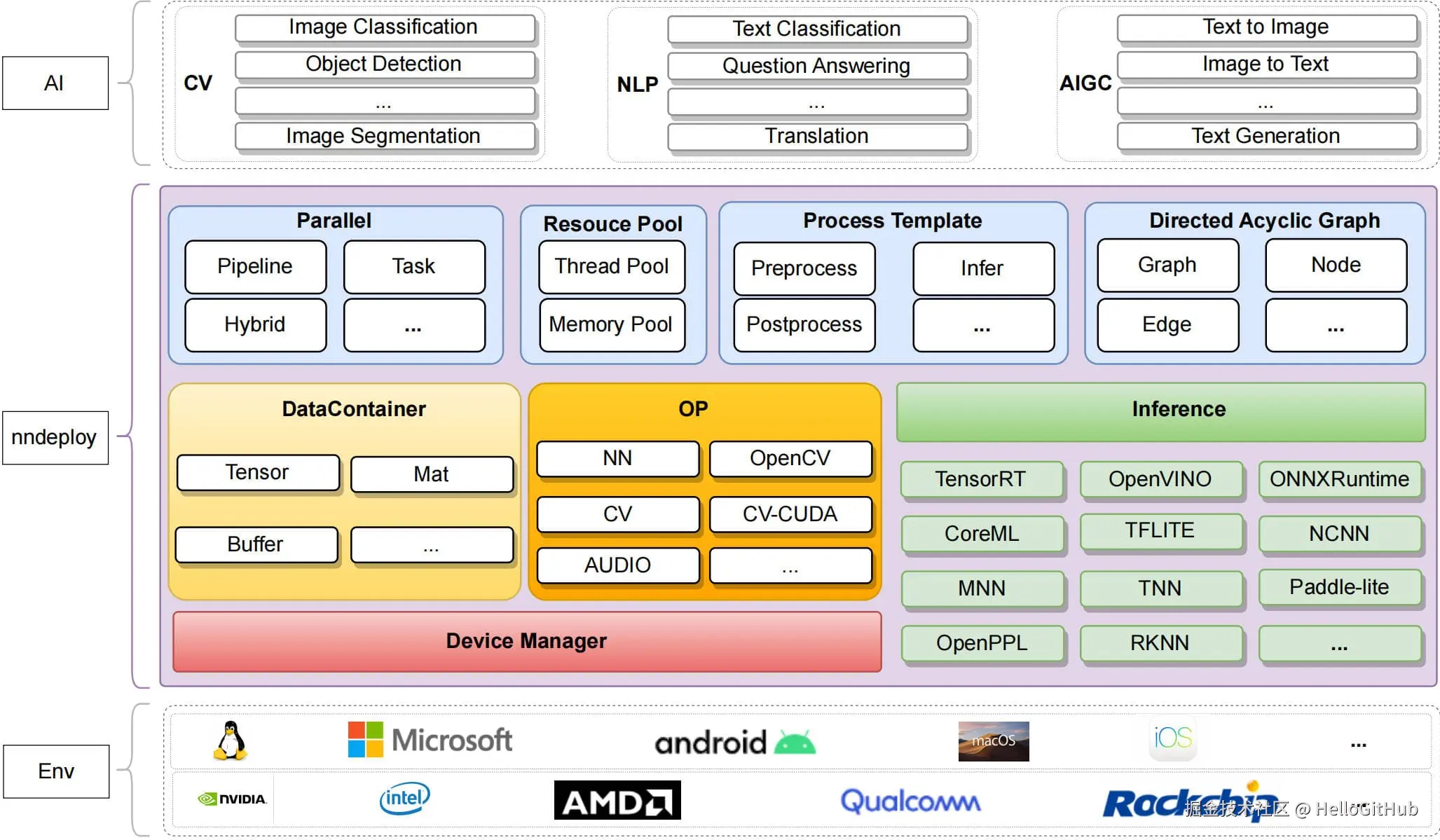 同时,框架提供异构设备抽象层 ,统一不同硬件编程模型。目前已支持 CPU(X86、ARM)、GPU(CUDA)、NPU(如华为昇腾 AscendCL)等,让同一份代码可在多种硬件平台上高效运行,实现一次开发,多端部署。