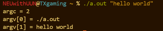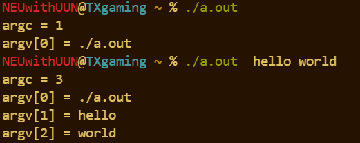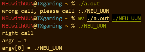 其实在上面的效果图中,我们能看出来 argv[0] 存储的就是调用命令,我们只需让其与我们规定的 ./NEU_UUN 进行比较即可