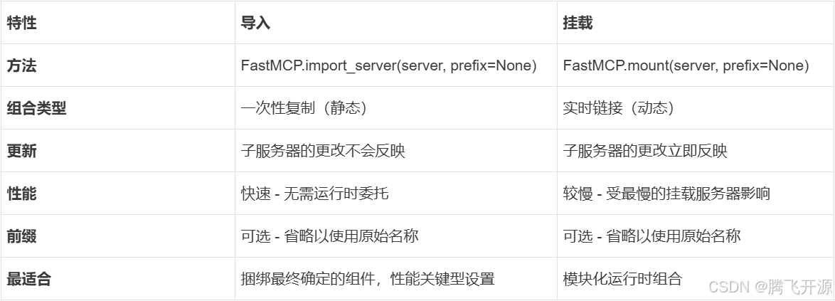 mount() 方法在 main_mcp 服务器和 subserver 之间创建实时链接。不是复制组件,而是将对匹配可选 prefix 的组件的请求在运行时委托给 subserver。如果未提供前缀,子服务器的组件可以在没有前缀的情况下访问。当多个服务器以相同的前缀(或无前缀)挂载时,对于冲突的组件名称,最近挂载的服务器优先。