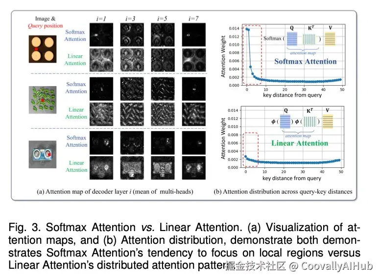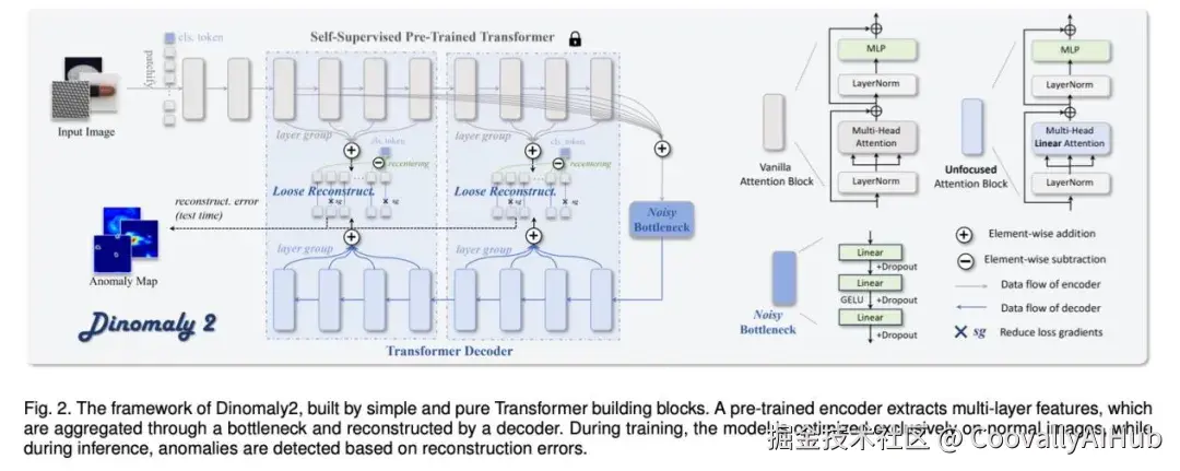 Transformer中的标准注意力机制过于"聚焦",能精准重构细节,这反而容易让模型"记住"异常。Dinomaly2采用线性注意力,它天生具有"散焦"特性,像一个低通滤波器,迫使模型学习全局的、正常的模式来进行重构,从而无法精确复现异常的局部细节。