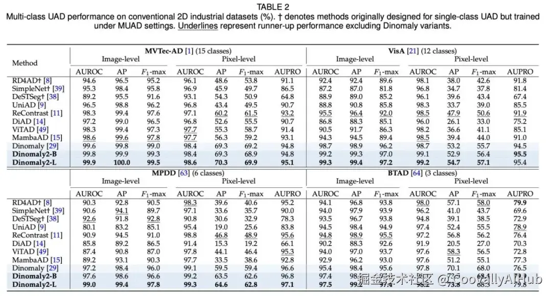 MVTec-AD图像级AUROC达到99.9%,VisA达到99.3%。研究者认为,这些数据集在Dinomaly2上已接近性能饱和。