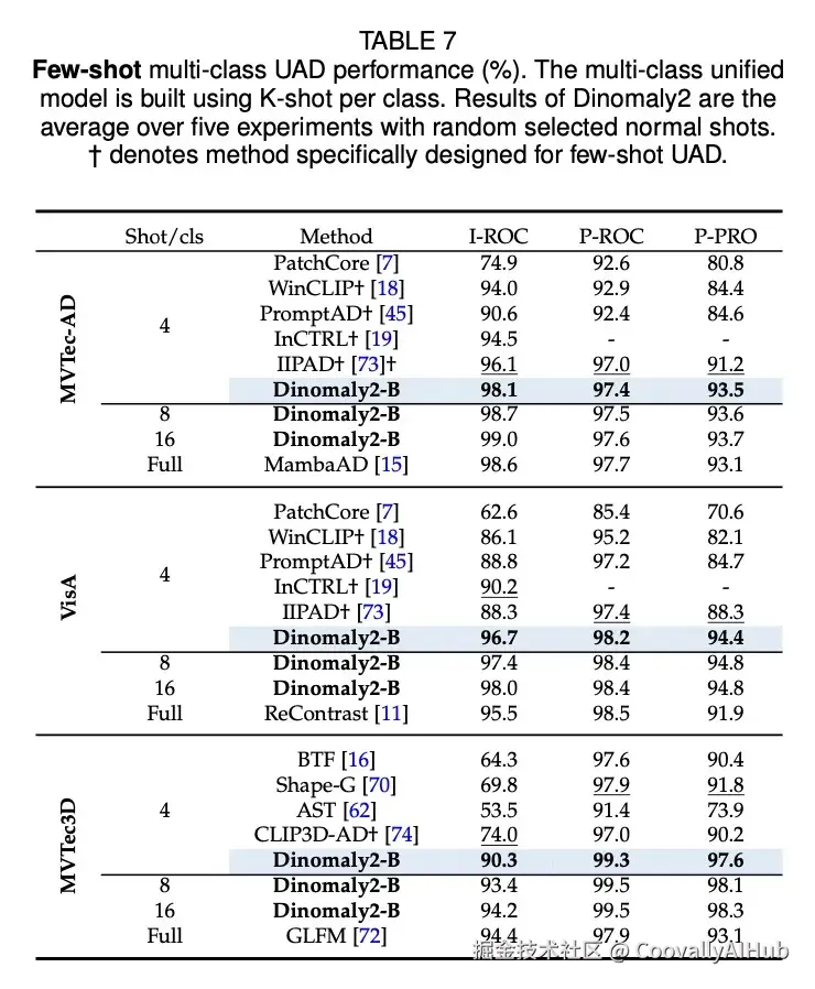 仅使用每类8个正常样本,在MVTec-AD和VisA上的表现就超越了之前所有全样本模型。