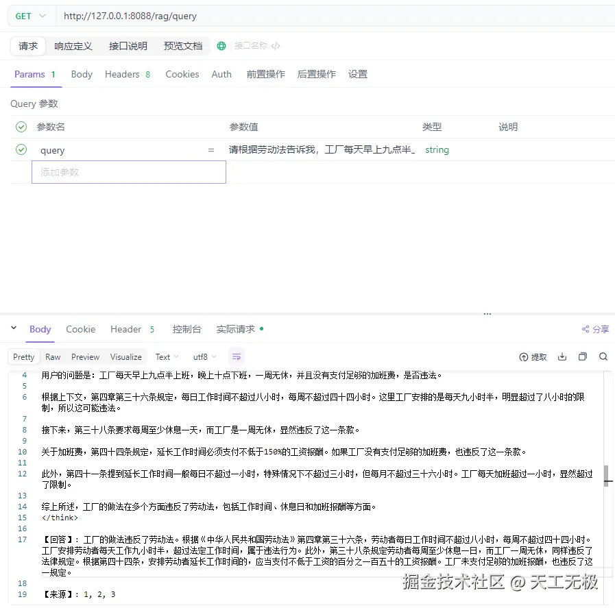 GET http://127.0.0.1:8088/rag/query?query=请根据劳动法告诉我,工厂每天早上九点上班,晚上十点下班,且没有支付足够响应报酬补偿的,一周无休,是否违法