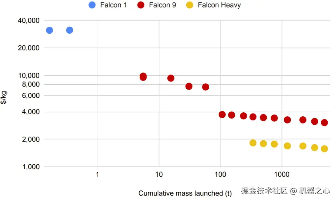自 Falcon 1 成功发射以来,按通胀调整后的「最低实现价格」统计的 SpaceX 有效载荷发射质量,按不同火箭类别递进展示。请注意,在 Falcon 9 和 Falcon Heavy 火箭出现了显著的价格跃降。
