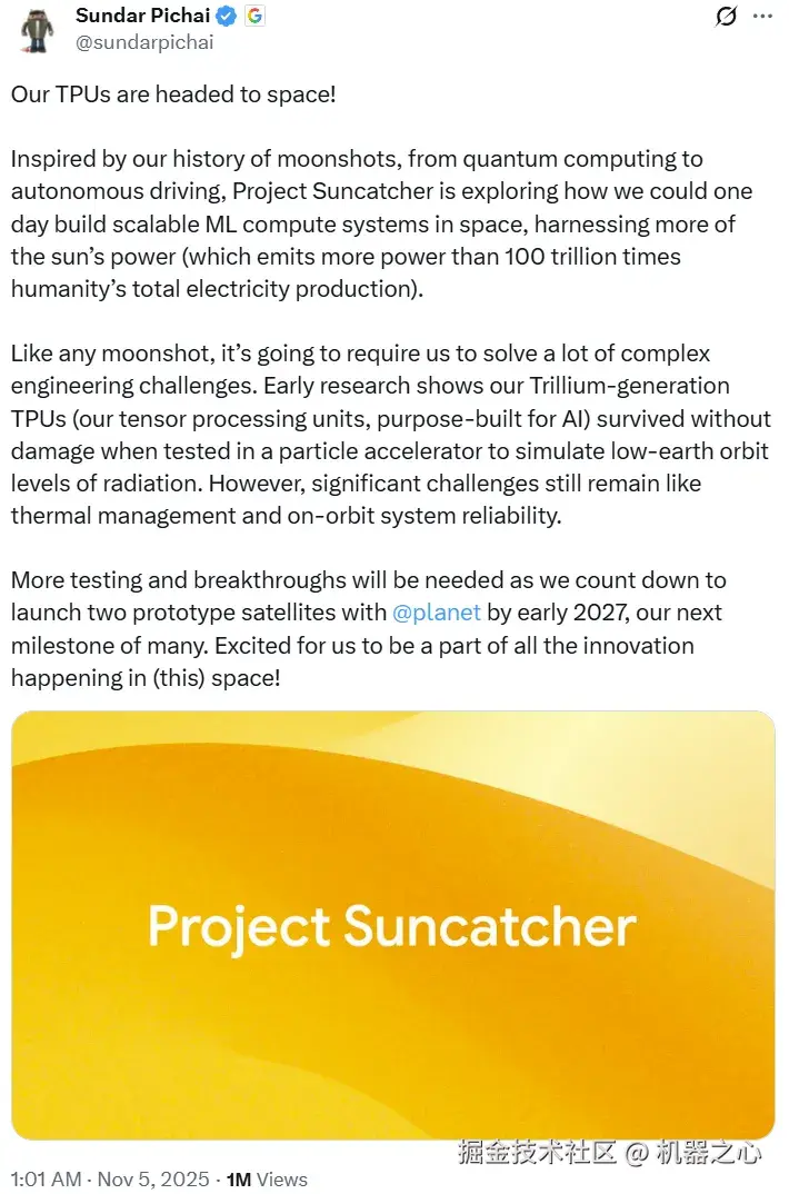 这个项目被命名为 Project Suncatcher(捕光者计划),这是一个「基于太空的可扩展 AI 基础设施系统设计」。谷歌 CEO Sundar Pichai 表示,此项目可以更好地利用太阳的能量来驱动 AI,毕竟太阳发出的能量比人类总电力生产量高出 100 万亿倍。