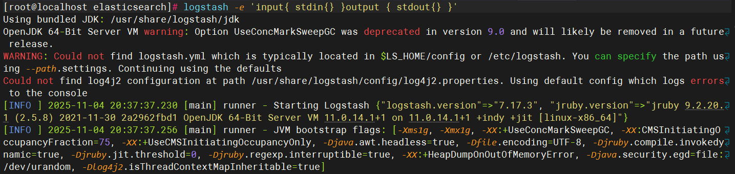 [root@localhost elasticsearch]# logstash -e 'input{ stdin{} }output { stdout{} }'