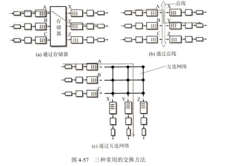 交换结构是路由器的核心组件,负责将分组从输入端口转移到正确的输出端口。