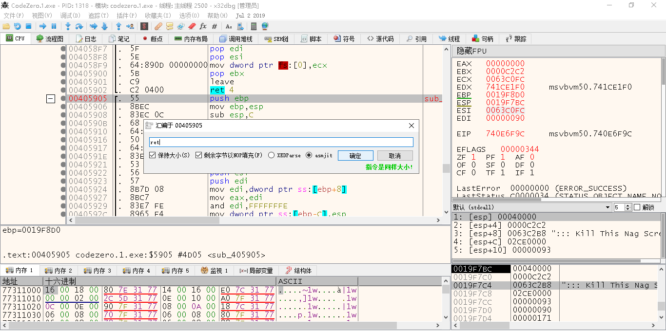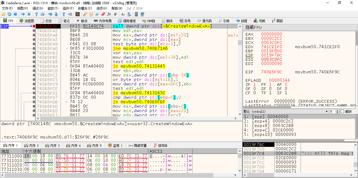 在od下断后在栈区看倒数第三个参数的窗口标题,运行几次断下来窗口标题是 "::: Kill This Nag Screen :::"
