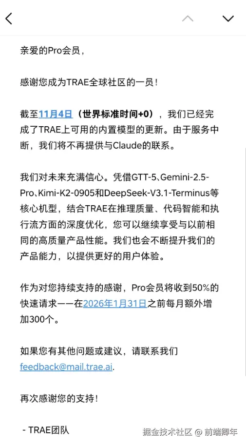 作为回馈,平台还将向Pro会员提供50%额外的快速请求额度,即每月新增300次请求,有效期至2026年1月31日。然而,在Reddit、GitHub等平台上,许多Trae用户对移除Claude模型的调整表示不满,并称将考虑转向其他同类型的AI编程工具。