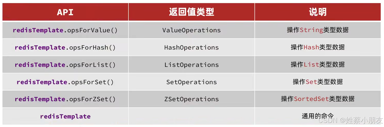 SpringDataRedis中提供了RedisTemplate工具类,将每个Redis数据类型的所有方法各封装成一个对象,使用该对象的方法对特定的Redis数据类型进行操作 :