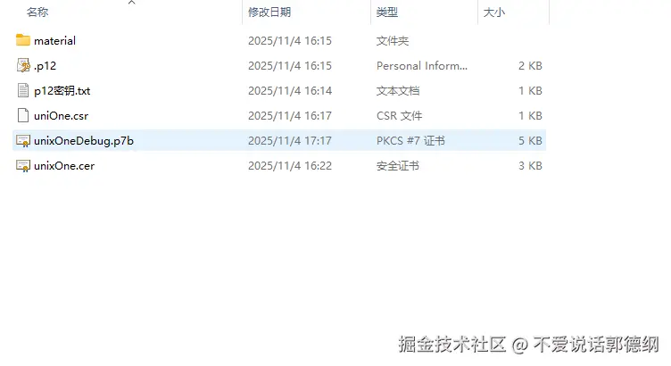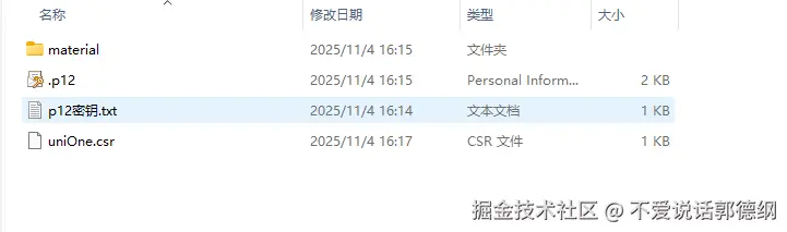 .p12):里面保存着数字签名用的私钥,由开发者自己手动生成或者 DevEco Studio 自动申请调试证书时自动生成。有两层密码保护(私钥库密码和私钥密码),须妥善保管,尤其是发布证书的私钥一定不能泄露。 - 证书文件(