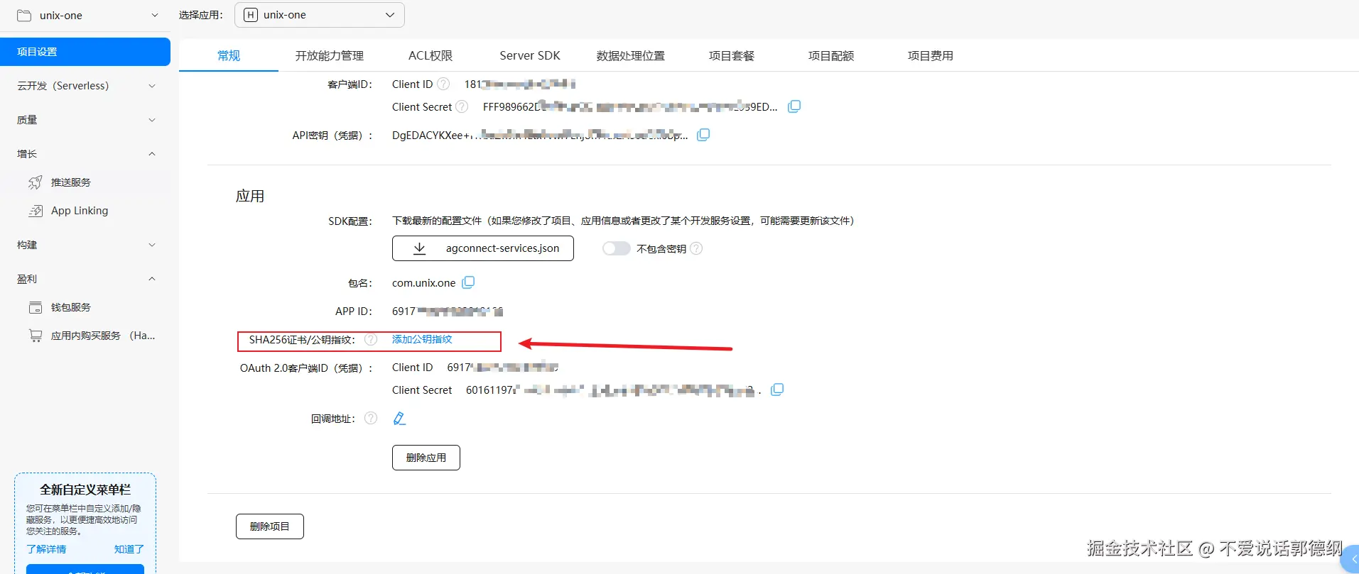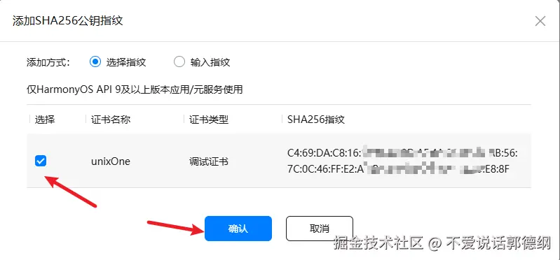 19.然后找到SHA256证书/公钥指纹:点击添加添加公钥指纹 (HarmonyOS API 9及以上),添加刚才创建的证书即可