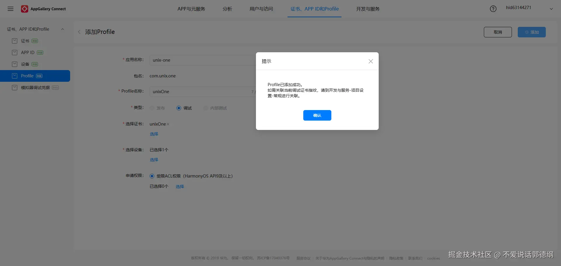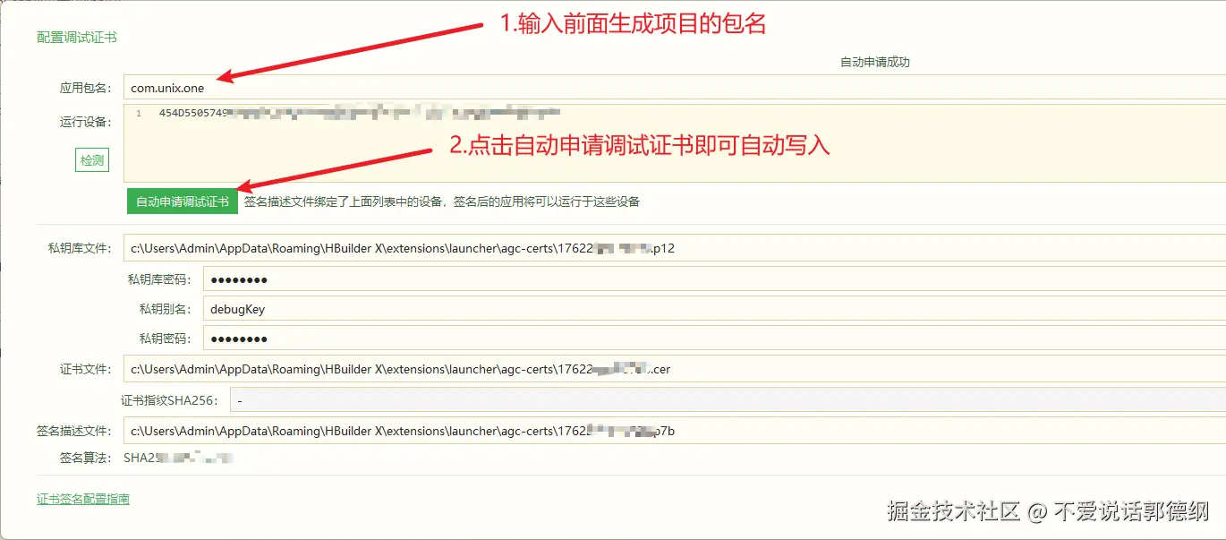 .cer):由华为签署颁发,用于证明开发者的身份。在 AppGallery Connect 手动申请并下载获得,或者在自动生成调试证书时自动下载。 - 签名描述文件(
