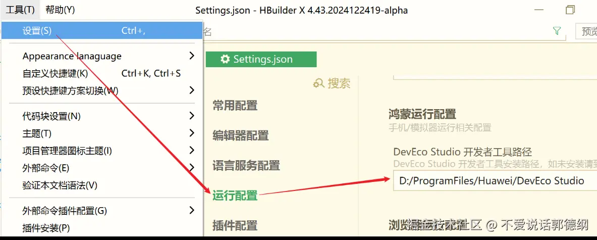 打开 HBuilderX,点击上方菜单 - 工具 - 设置,再点击 运行配置,在鸿蒙运行配置中设置 DevEco Studio 的安装路径