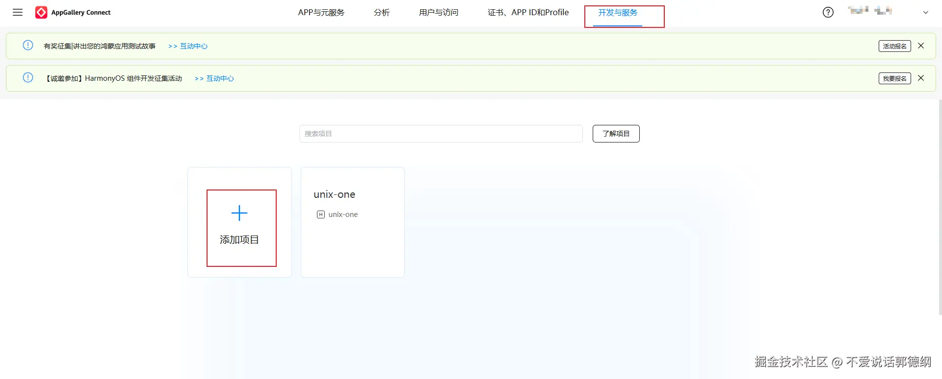 11.点击开发与服务,选择自己的项目,没有项目的可以先添加项目,如图所示: