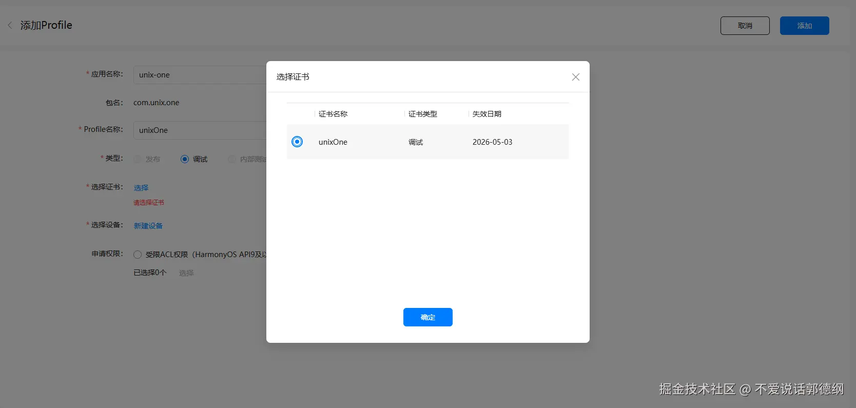 .p7b):由华为颁发,里面包含了跟应用相关的签名信息,如包名、ACL 权限等,调试证书还包括可用于调试运行的设备列表。在 AppGallery Connect 手动添加并下载获得,或者在自动生成调试证书时自动下载。
