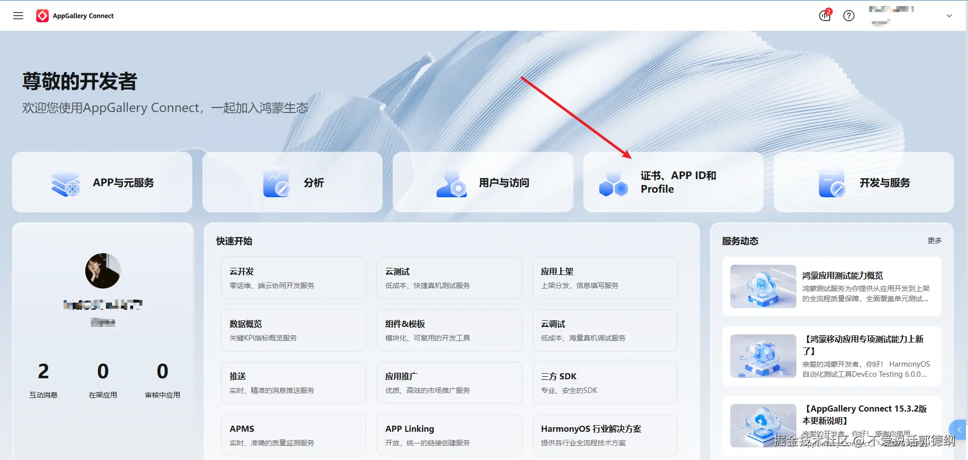 7.打开AppGallery Connect平台,需要登陆华为账号。登录成功后,点击 证书、APP ID和Proflie