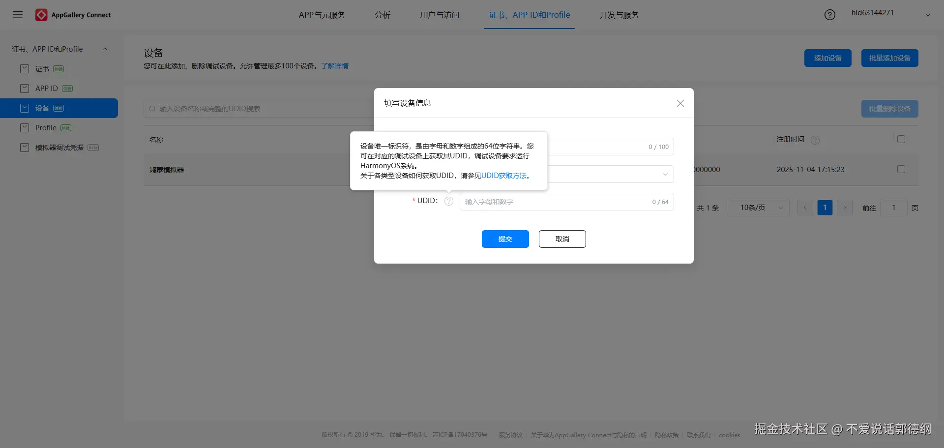 15.先添加自己的设备,用 DevEco Studio模拟器的同学们,如果不知道UDID,可以直接在HbuliderX运行到鸿蒙模拟器,点击查看调试证书,即可看到模拟器UDID
