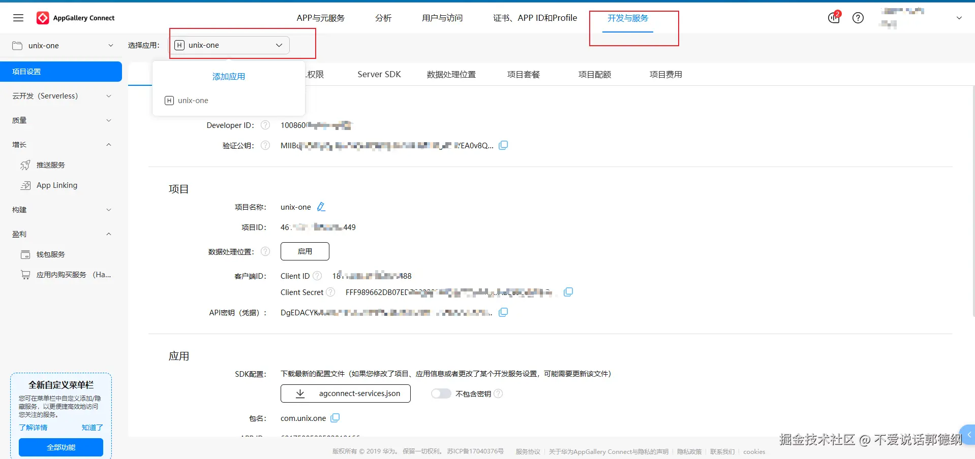 18.现在证书都已经生成好了,然后再去把对应项目关联一下证书,点击 开发与服务,选择对应的项目