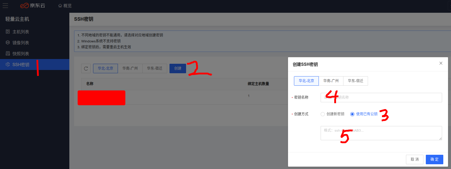 进入https://lavm-console.jdcloud.com/lavm/list网址,点击SSH秘钥-->创建--> 选择使用已有公钥 --> 填写秘钥名称 --> 添加本地秘钥(~/.ssh/id_rsa.pub中的内容)