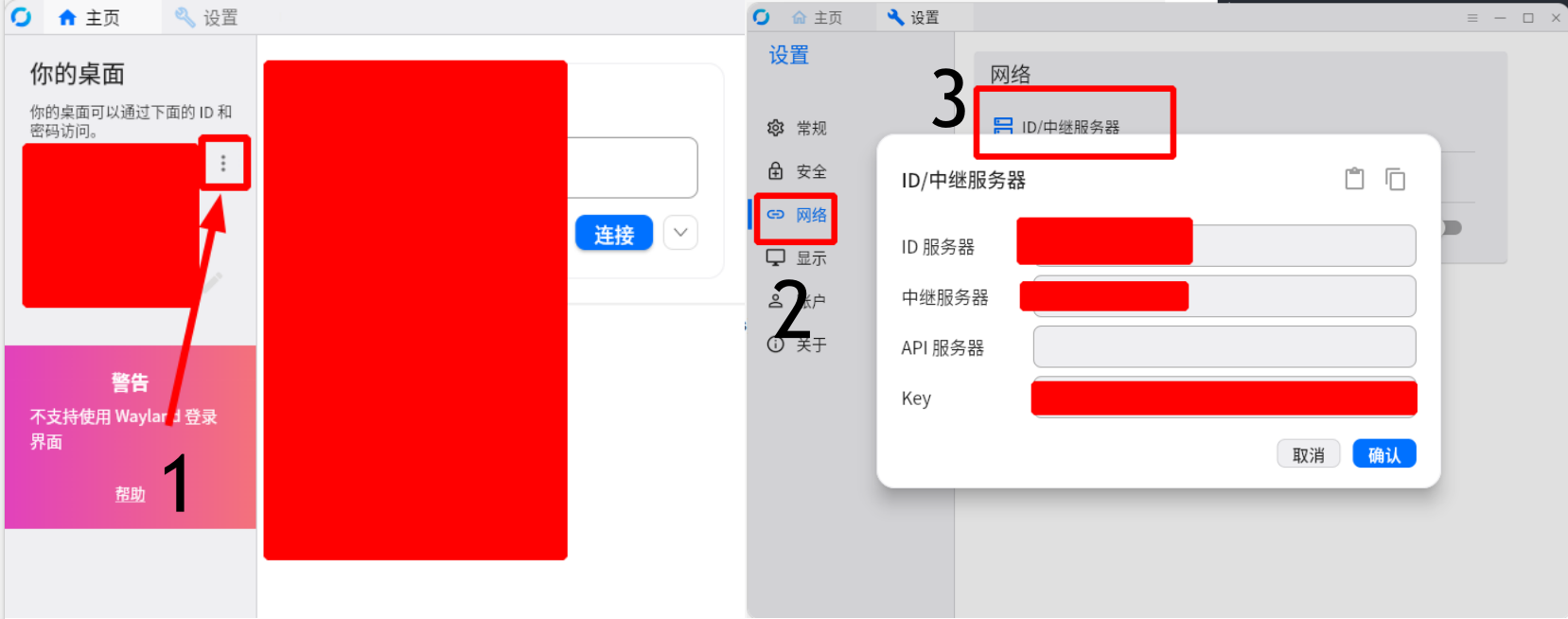 前往RustDesk 客户端 Github 发布地址根据系统下载安装rustdesk客户端软件,然后点击图中的三个点-->网络-->中继服务器进行客户端配置