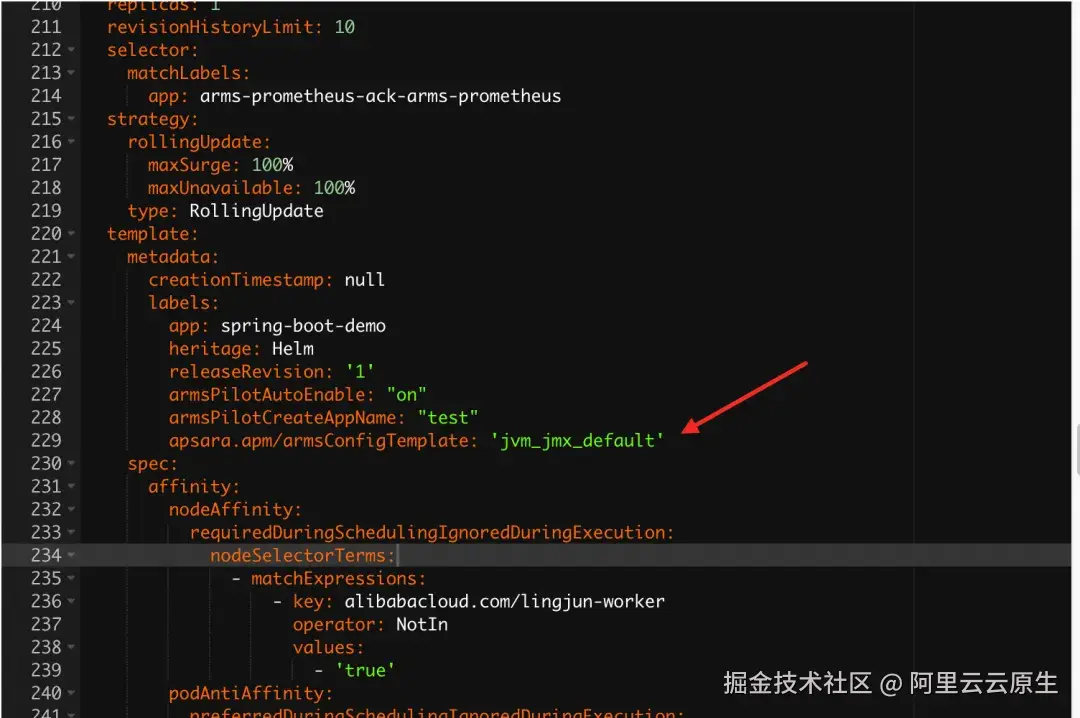 方式 2:修改应用的 yaml 时,新增加一个名为 apsara.apm/armsConfigTemplate 的 label,该 label 对应的 value 为预期生效的模板名称(注意,方式 2 优先级高于方式 1),以 jvm_jmx_default 这个模板为例,应用的 yaml 需要修改为下述形式。