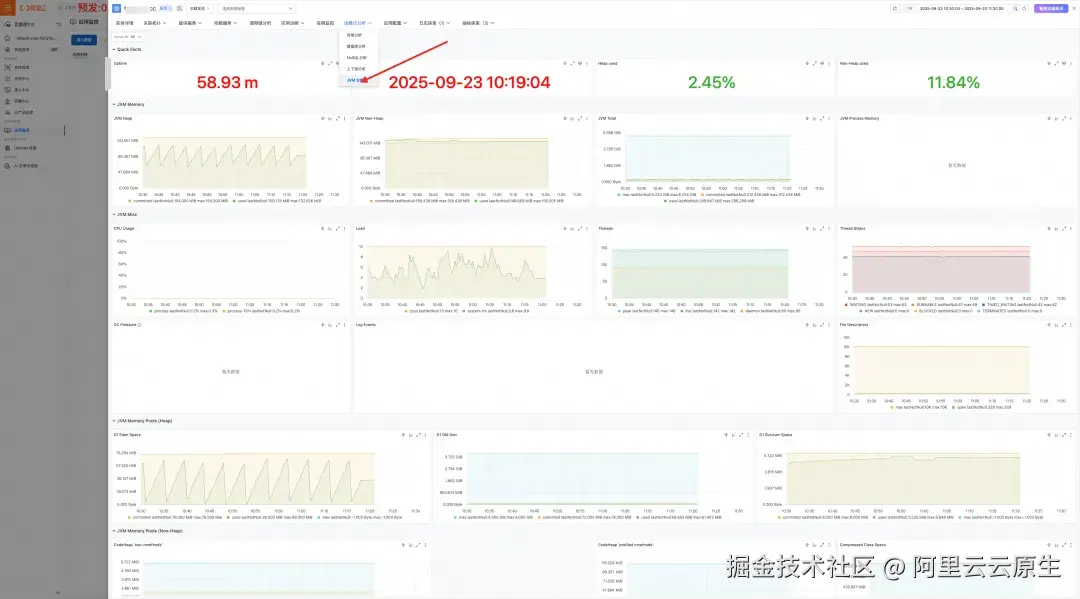 1\] 云监控 2.0 控制台 [cmsnext.console.aliyun.com/next/home](https://link.juejin.cn?target=https%3A%2F%2Fcmsnext.console.aliyun.com%2Fnext%2Fhome "https://cmsnext.console.aliyun.com/next/home") \[2\] 接入文档 [help.aliyun.com/zh/arms/app...](https://link.juejin.cn?target=https%3A%2F%2Fhelp.aliyun.com%2Fzh%2Farms%2Fapplication-monitoring%2Fuser-guide%2Finstall-arms-agent-for-java-applications-deployed-in-ack-and-acs "https://help.aliyun.com/zh/arms/application-monitoring/user-guide/install-arms-agent-for-java-applications-deployed-in-ack-and-acs") \[3\] 接入文档 [help.aliyun.com/zh/arms/app...](https://link.juejin.cn?target=https%3A%2F%2Fhelp.aliyun.com%2Fzh%2Farms%2Fapplication-monitoring%2Fuser-guide%2Fmanually-install-arms-agent-for-java-applications "https://help.aliyun.com/zh/arms/application-monitoring/user-guide/manually-install-arms-agent-for-java-applications") \[4\] JVM 监控大盘 [grafana.com/grafana/das...](https://link.juejin.cn?target=https%3A%2F%2Fgrafana.com%2Fgrafana%2Fdashboards%2F4701-jvm-micrometer%2F "https://grafana.com/grafana/dashboards/4701-jvm-micrometer/") \[5\] 探针插件开关配置指南 [help.aliyun.com/zh/arms/app...](https://link.juejin.cn?target=https%3A%2F%2Fhelp.aliyun.com%2Fzh%2Farms%2Fapplication-monitoring%2Fuser-guide%2Fcustom-configuration%3Fspm%3Da2c4g.11186623.help-menu-search-34364.d_1%255B%23f6cd23c7035fd%255D "https://help.aliyun.com/zh/arms/application-monitoring/user-guide/custom-configuration?spm=a2c4g.11186623.help-menu-search-34364.d_1%5B#f6cd23c7035fd%5D") \[6\] 持续剖析性能诊断实践 [help.aliyun.com/zh/arms/app...](https://link.juejin.cn?target=https%3A%2F%2Fhelp.aliyun.com%2Fzh%2Farms%2Fapplication-monitoring%2Fuser-guide%2Fhow-to-locate-performance-bottlenecks-via-flame-chart "https://help.aliyun.com/zh/arms/application-monitoring/user-guide/how-to-locate-performance-bottlenecks-via-flame-chart") \[7\] OT-SDK 自定义指标接入手册 [help.aliyun.com/zh/arms/app...](https://link.juejin.cn?target=https%3A%2F%2Fhelp.aliyun.com%2Fzh%2Farms%2Fapplication-monitoring%2Fuse-cases%2Fcustomize-metrics-by-using-the-opentelemetry-java-sdk "https://help.aliyun.com/zh/arms/application-monitoring/use-cases/customize-metrics-by-using-the-opentelemetry-java-sdk")