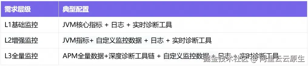 - 基础监控诉求:对于测试、预发、非核心应用、成本敏感等场景,基础 JVM 监控指标(如堆内存、GC 行为)结合轻量化诊断能力(内存 Dump、持续性能剖析、Arthas 实时诊断)即可满足多数线上问题排查诉求。