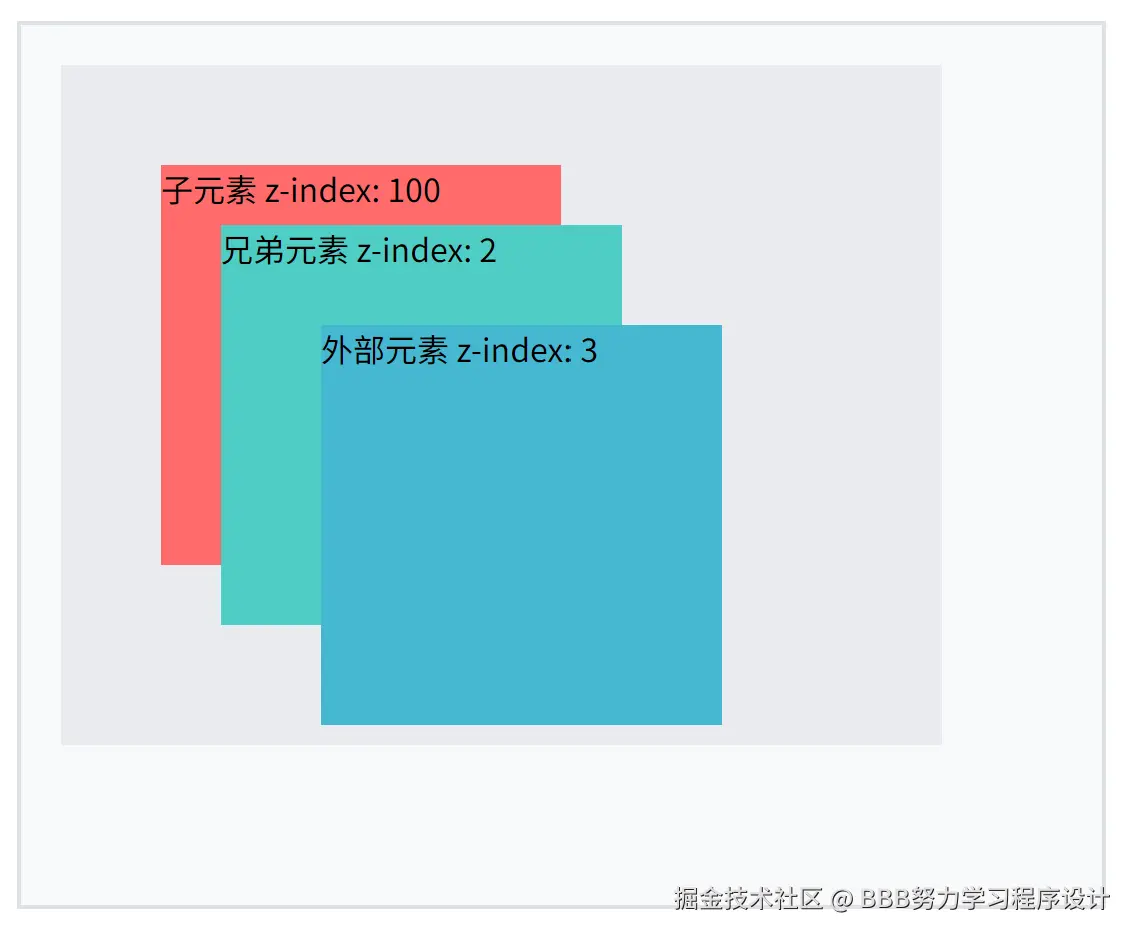 z-index只在父元素的堆叠上下文中有效,无法与父堆叠上下文外的元素比较。