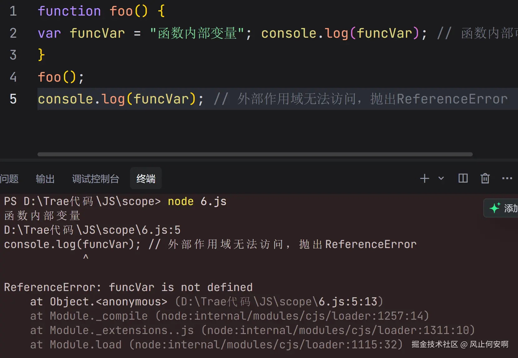 var funcVar = "函数内部变量"; console.log(funcVar); // 函数内部可访问,输出"函数内部变量"
