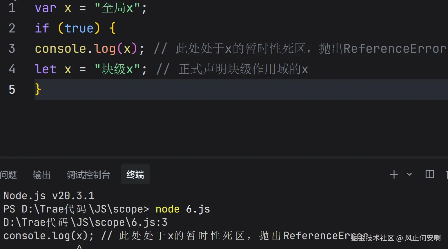 console.log(x); // 此处处于x的暂时性死区,抛出ReferenceError