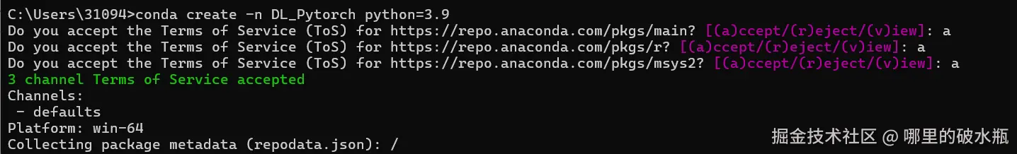 conda 会询问你是否接受 Anaconda 的 使用条款(Terms of Service, ToS),这是在下载和安装包时的一个法律声明。