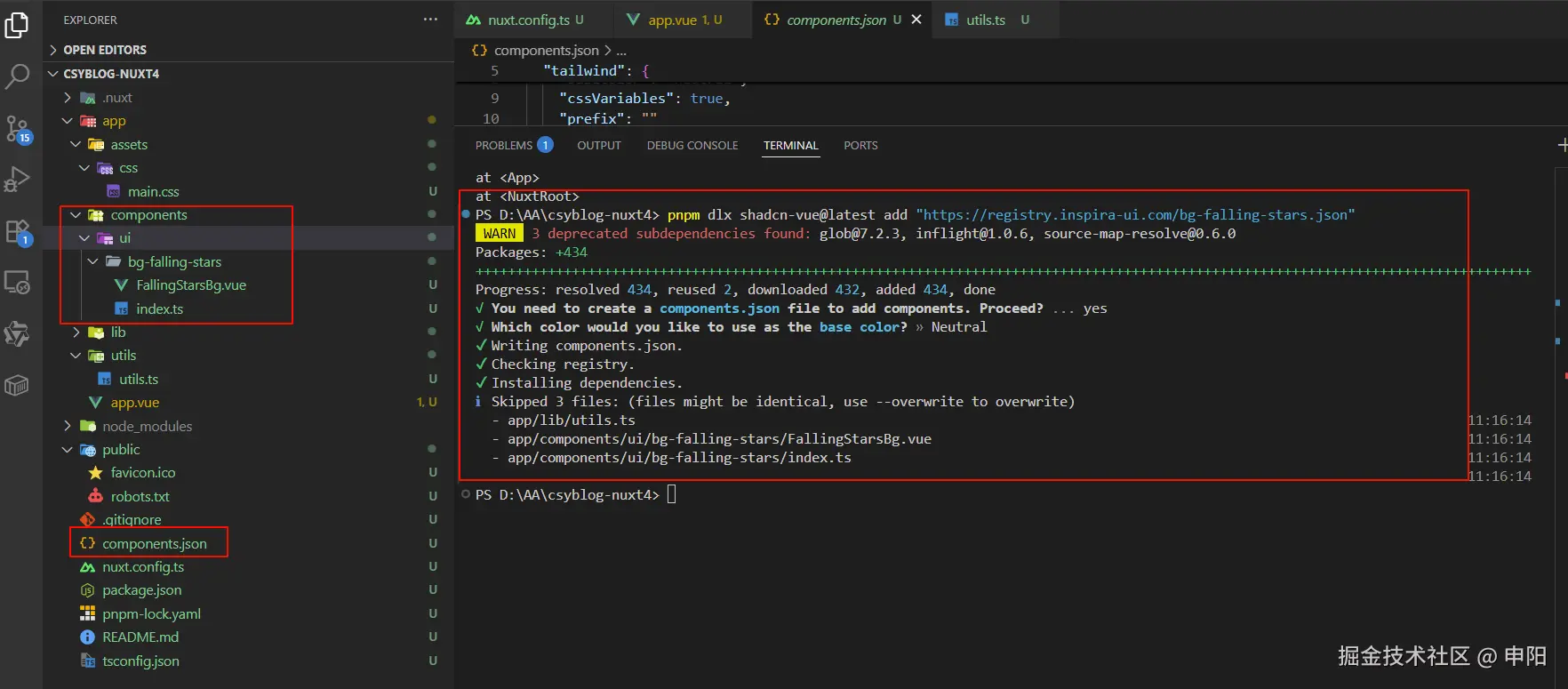 依旧没有生效,观察目录结构后发现,生成的组件目录并没有遵守 Nuxt 的默认约定,所以这里没有识别出来,手动引入试了一下,可以了。