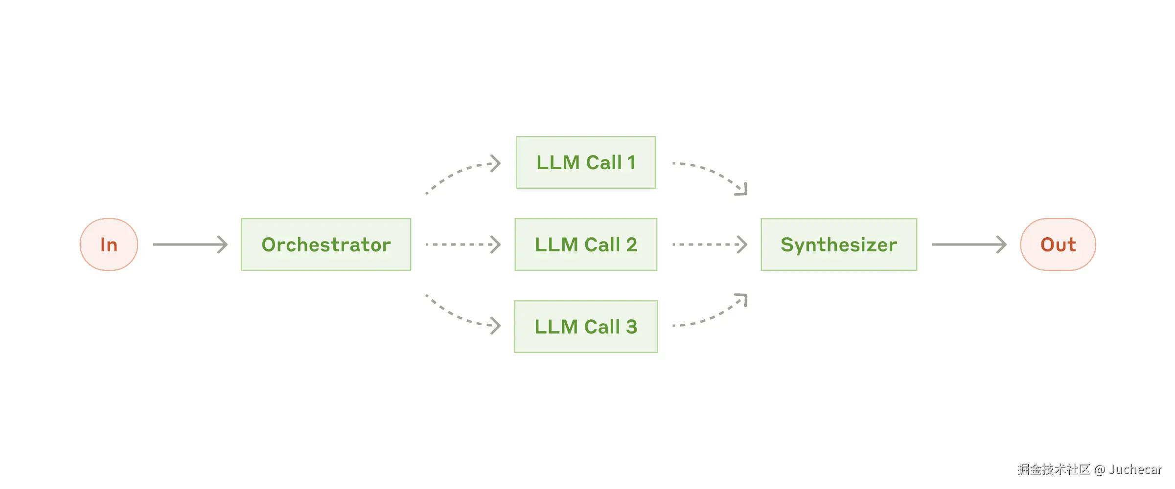 在此工作流中,一个中心 LLM 动态分解任务,委派给多个"工作者" LLM,并综合其结果。