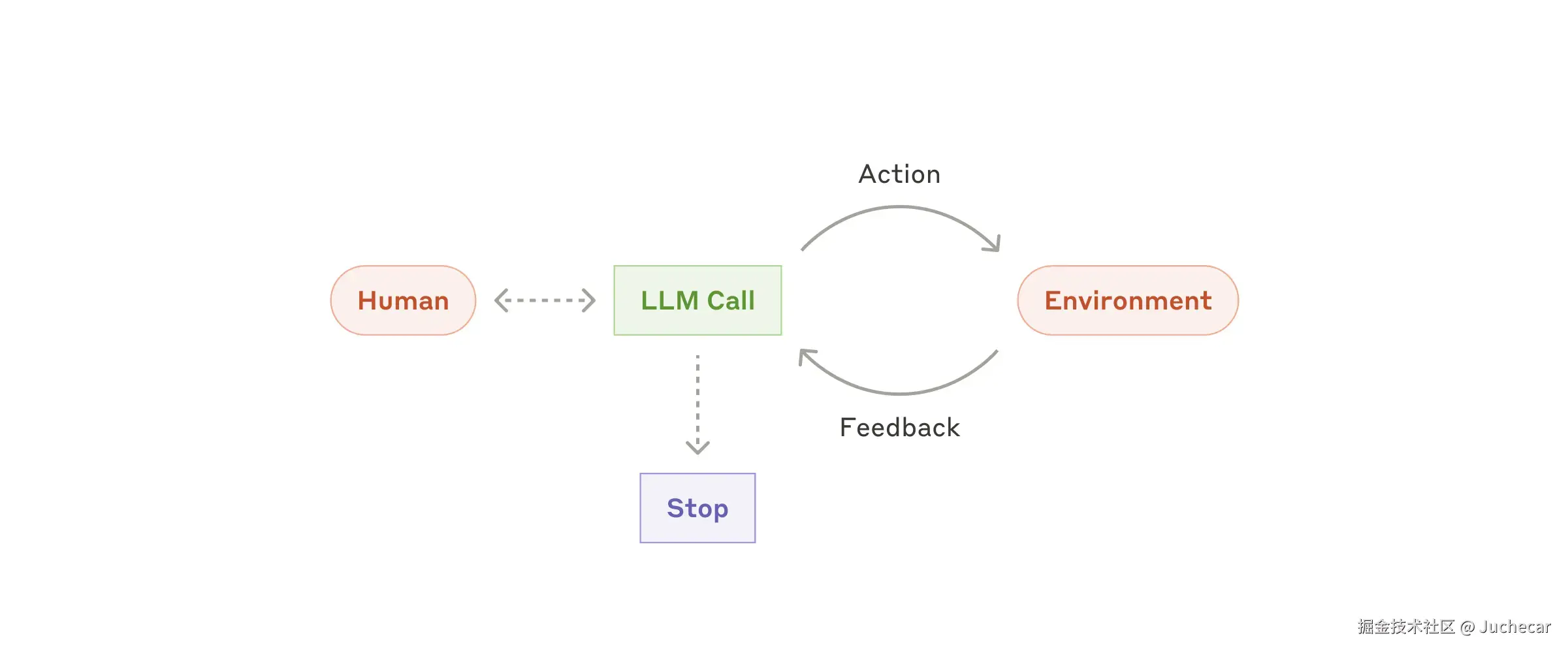 - 智能体:由 LLM 动态主导自身流程和工具使用的系统,对如何完成任务拥有控制权。
