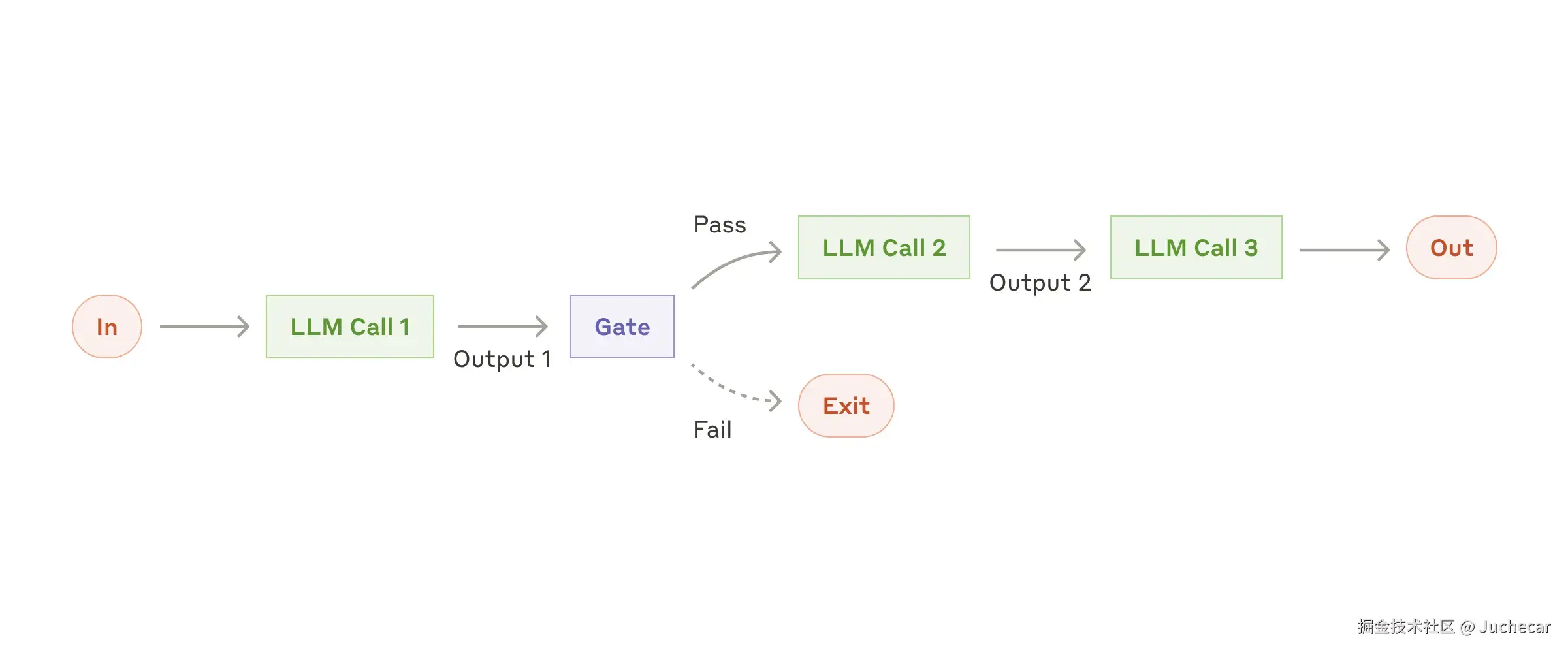 提示链将任务分解为一系列步骤,每个 LLM 调用处理前一步的输出。你可以在任何中间步骤添加程序化检查(见下图中的"gate"),以确保流程仍在正确轨道上。