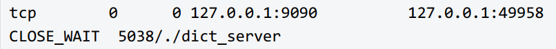 小结:对于 服务器上出现大量的 CLOSE_WAIT 状态, 原因就是 服务器没有 正确的关闭socket ! ! !, 导致四次挥手没有正确完成 . 这是一个 BUG. 只需要加上对应的 close 即可解决问题