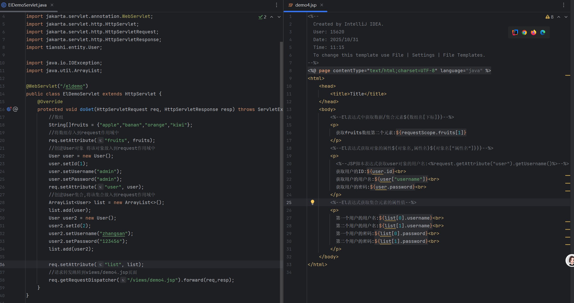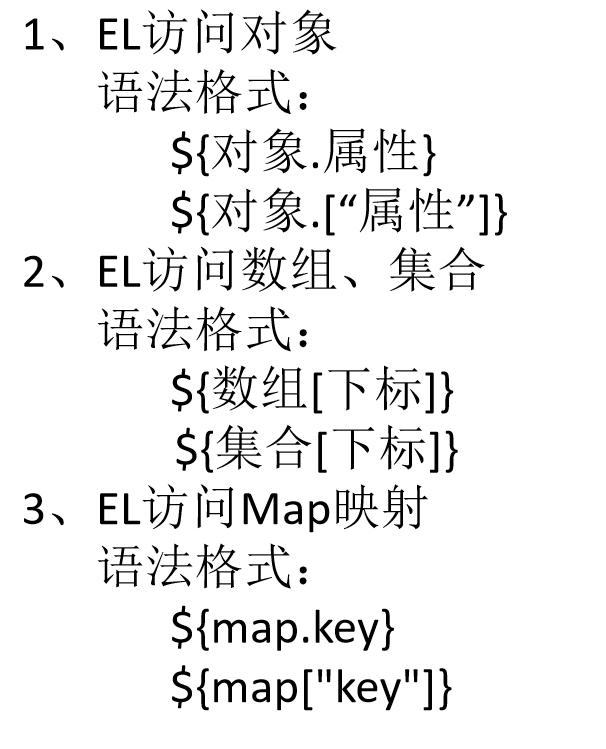 - EL表达式主要用于访问作用域中的对象、执行算术和逻辑运算、调用JavaBean的方法等