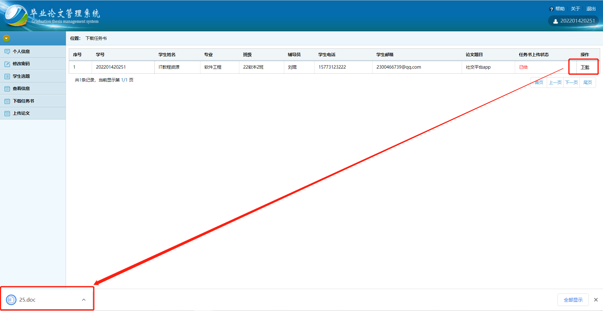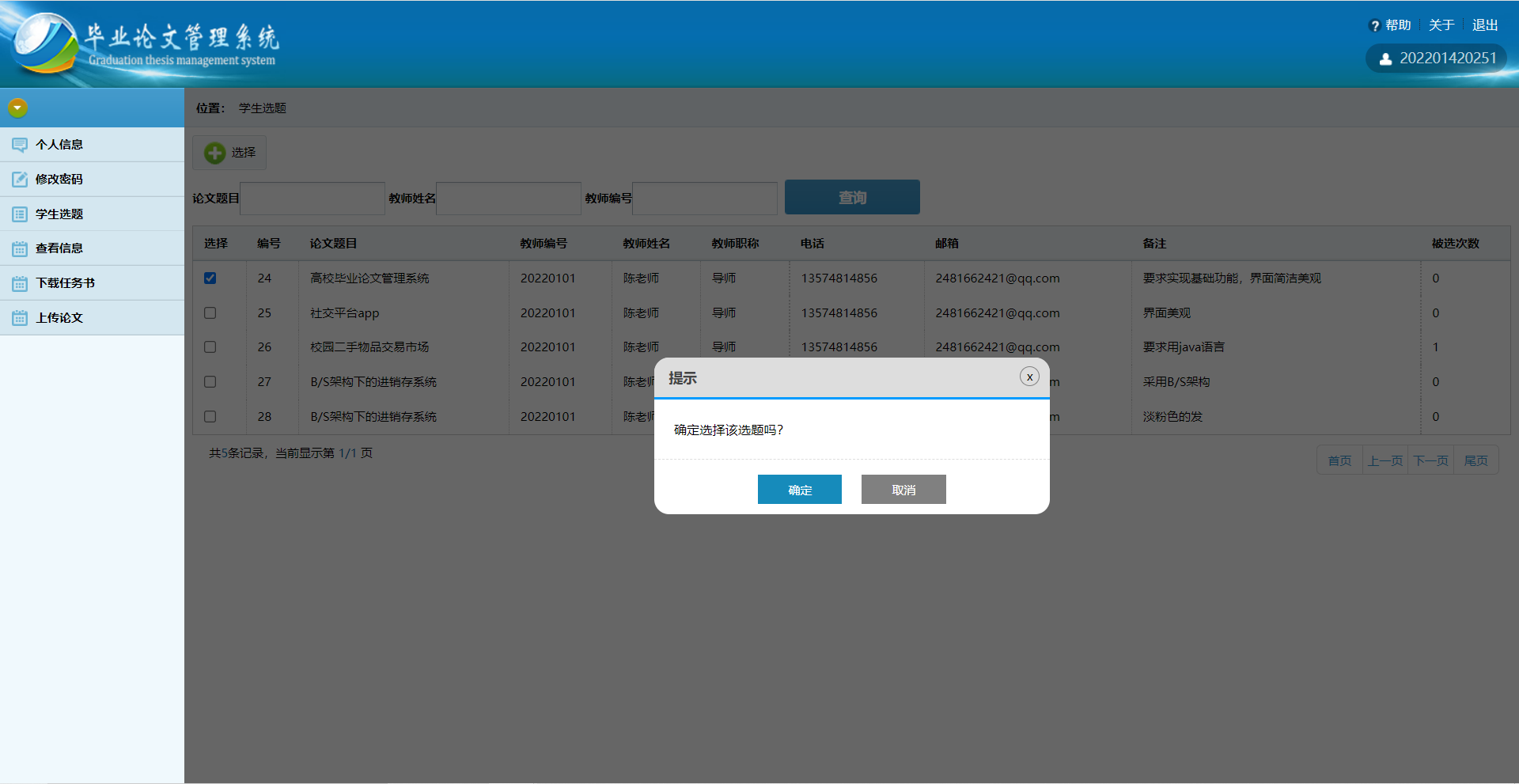 学生模块:登陆、个人信息、学生选题、查看信息、选择学生、下载任务书、上传论文